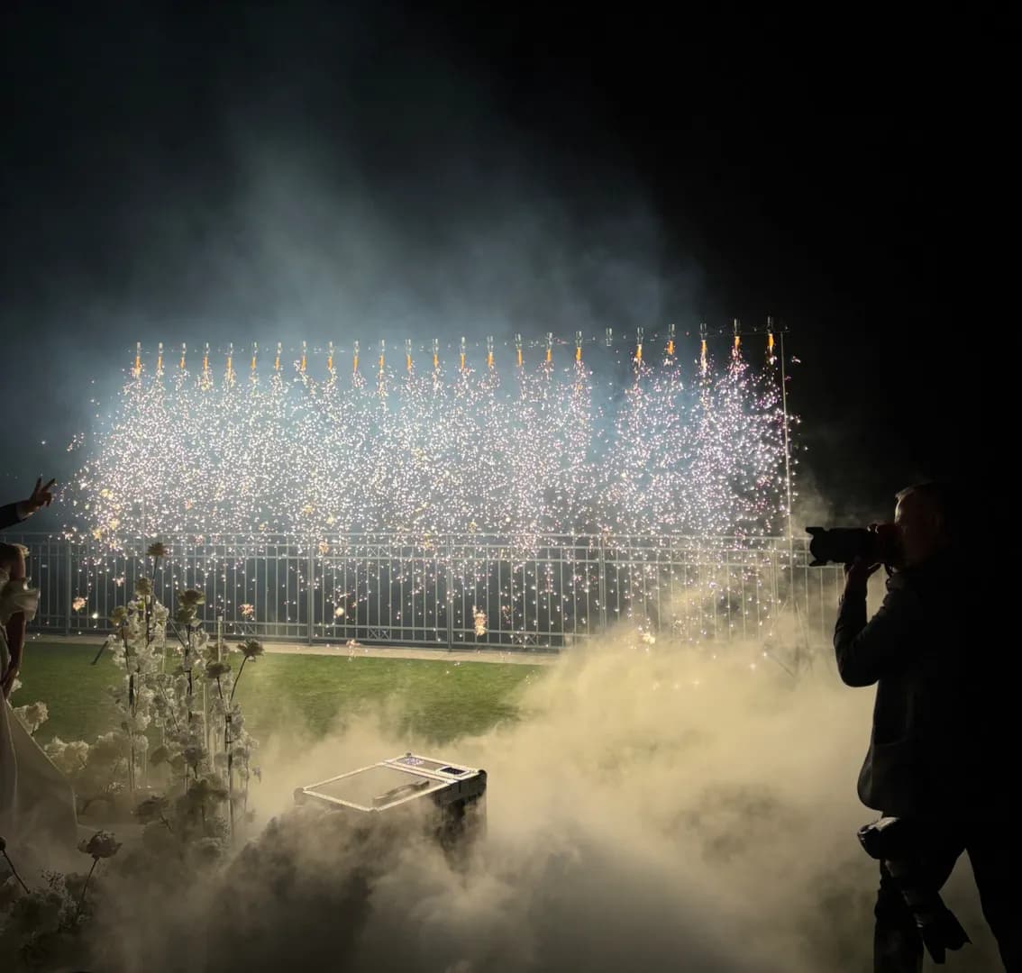 Kaskada złotych iskier spadających z góry tworzy efekt przypominający błyszczący wodospad. Delikatne, opadające iskry budują romantyczny i luksusowy klimat, który wygląda spektakularnie zarówno na żywo, jak i na zdjęciach oraz nagraniach wideo.